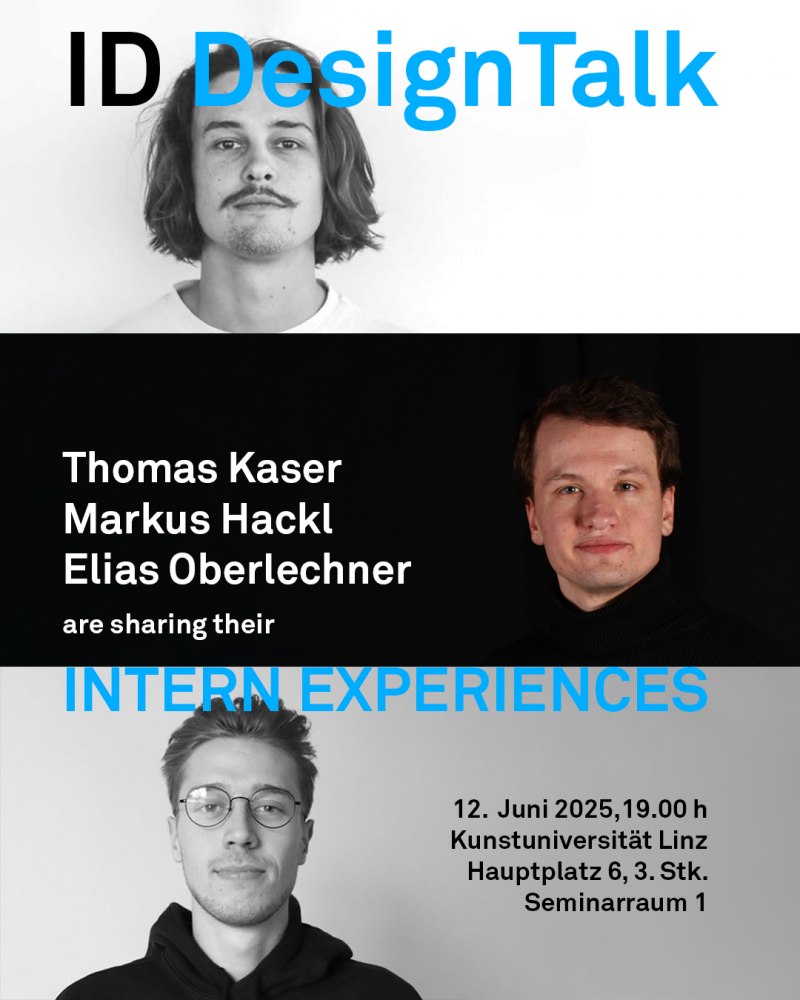 ID Students are sharing their Intern Experiences THOMAS KASER // Studio Oberhauser (IT) MARKUS HACKL // LEGO (DK) ELIAS OBERLECHNER // Komperdell (AT), Dynafit (IT) 12.06.2025 // 19.00 // Kunstuniversität …